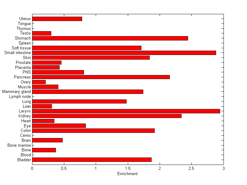 The expression level is normalized with tissue-library size. Each value for a gene in a tissue is a ratio of observed ESTs to the expected one in this tissue. The expected number of ESTs is the product of total ESTs of the gene and the fraction of total ESTs in the tissue among all ESTs in 30 tissues.