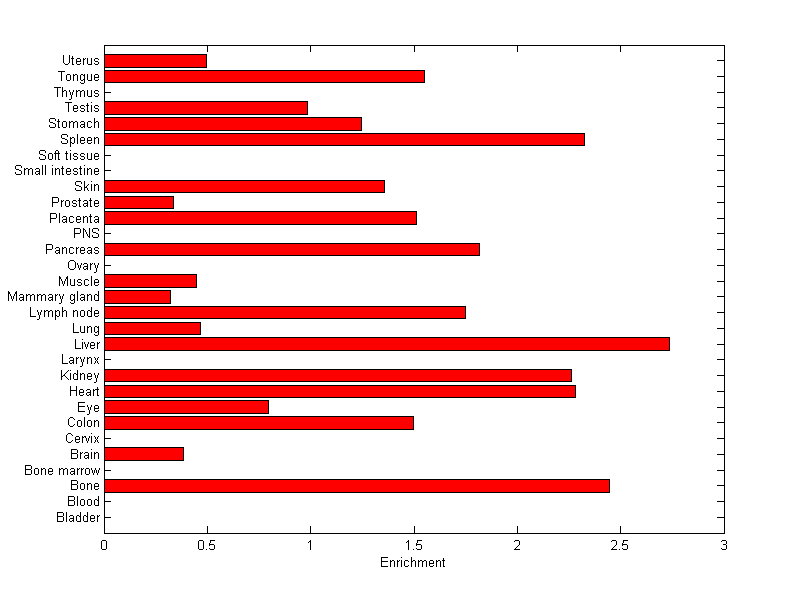 The expression level is normalized with tissue-library size. Each value for a gene in a tissue is a ratio of observed ESTs to the expected one in this tissue. The expected number of ESTs is the product of total ESTs of the gene and the fraction of total ESTs in the tissue among all ESTs in 30 tissues.