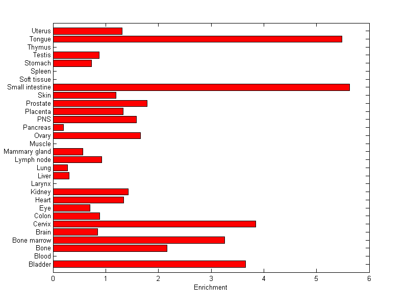 The expression level is normalized with tissue-library size. Each value for a gene in a tissue is a ratio of observed ESTs to the expected one in this tissue. The expected number of ESTs is the product of total ESTs of the gene and the fraction of total ESTs in the tissue among all ESTs in 30 tissues.
