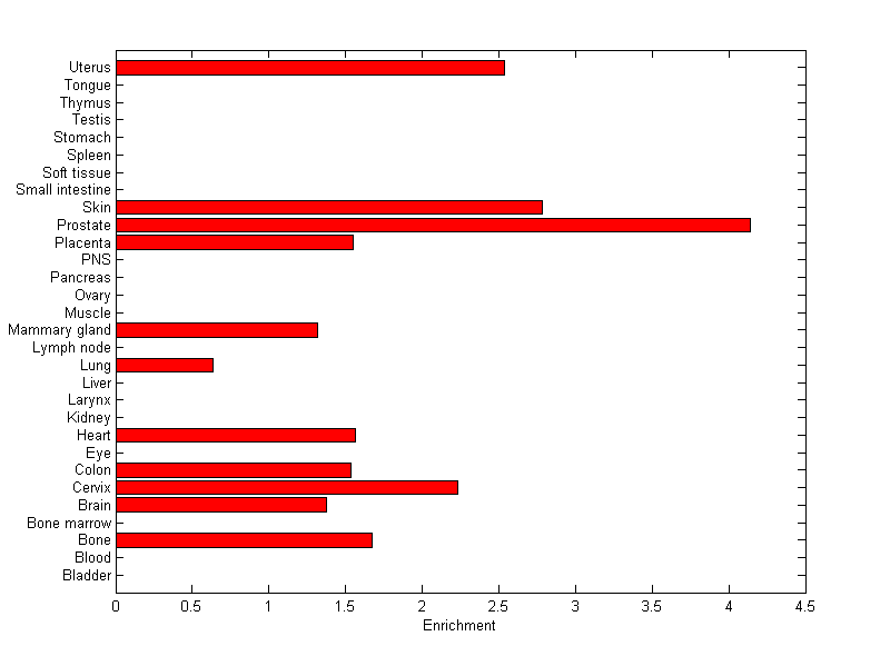 The expression level is normalized with tissue-library size. Each value for a gene in a tissue is a ratio of observed ESTs to the expected one in this tissue. The expected number of ESTs is the product of total ESTs of the gene and the fraction of total ESTs in the tissue among all ESTs in 30 tissues.