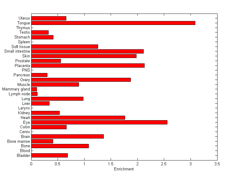 The expression level is normalized with tissue-library size. Each value for a gene in a tissue is a ratio of observed ESTs to the expected one in this tissue. The expected number of ESTs is the product of total ESTs of the gene and the fraction of total ESTs in the tissue among all ESTs in 30 tissues.