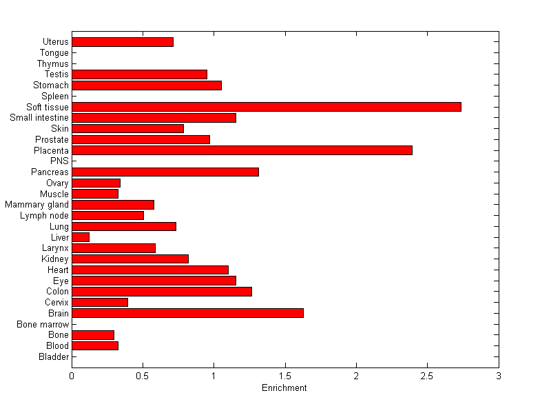 The expression level is normalized with tissue-library size. Each value for a gene in a tissue is a ratio of observed ESTs to the expected one in this tissue. The expected number of ESTs is the product of total ESTs of the gene and the fraction of total ESTs in the tissue among all ESTs in 30 tissues.