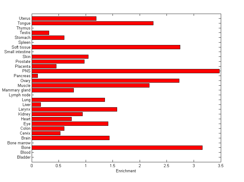 The expression level is normalized with tissue-library size. Each value for a gene in a tissue is a ratio of observed ESTs to the expected one in this tissue. The expected number of ESTs is the product of total ESTs of the gene and the fraction of total ESTs in the tissue among all ESTs in 30 tissues.