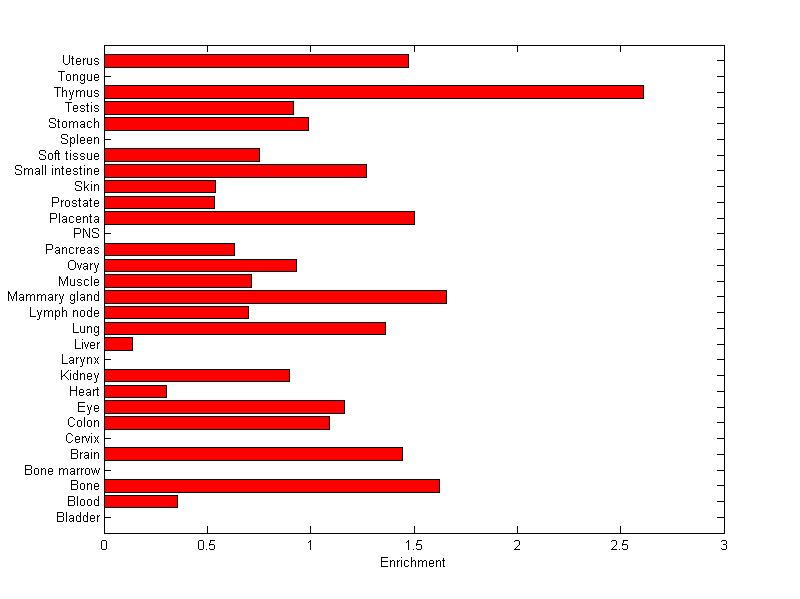 The expression level is normalized with tissue-library size. Each value for a gene in a tissue is a ratio of observed ESTs to the expected one in this tissue. The expected number of ESTs is the product of total ESTs of the gene and the fraction of total ESTs in the tissue among all ESTs in 30 tissues.