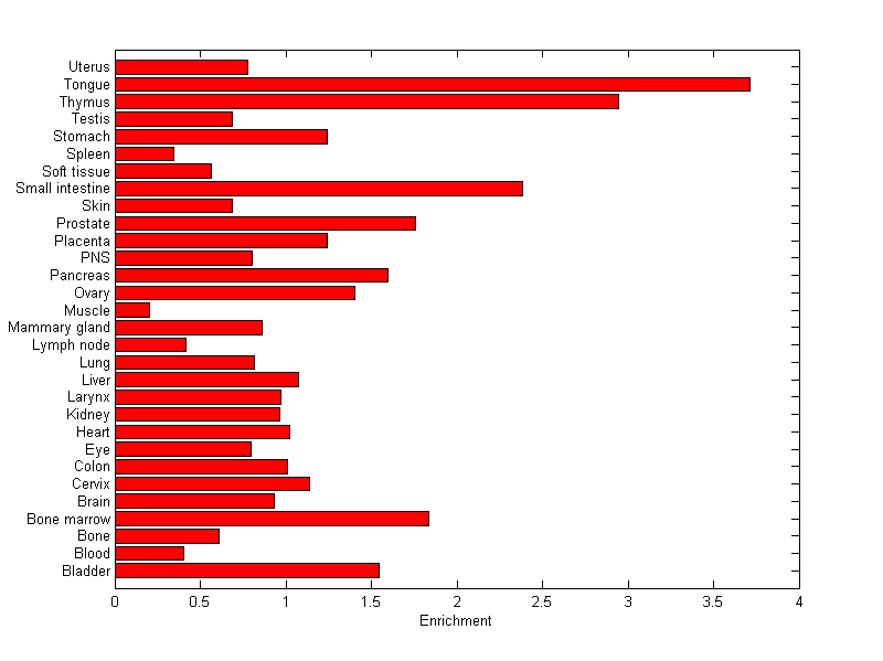 The expression level is normalized with tissue-library size. Each value for a gene in a tissue is a ratio of observed ESTs to the expected one in this tissue. The expected number of ESTs is the product of total ESTs of the gene and the fraction of total ESTs in the tissue among all ESTs in 30 tissues.