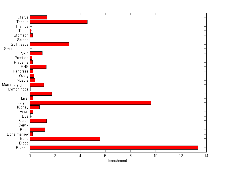 About the profile: The expression level is normalized with tissue-library size. Each value for a gene in a tissue is a ratio of observed ESTs to the expected one in this tissue. The expected number of ESTs is the product of total ESTs of the gene and the fraction of total ESTs in the tissue among all ESTs in 30 tissues. Summary: This gene is preferentially expressed in [bladder, bone, larynx] Download: |