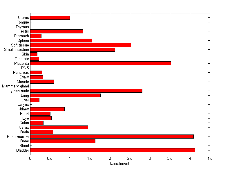 The expression level is normalized with tissue-library size. Each value for a gene in a tissue is a ratio of observed ESTs to the expected one in this tissue. The expected number of ESTs is the product of total ESTs of the gene and the fraction of total ESTs in the tissue among all ESTs in 30 tissues.