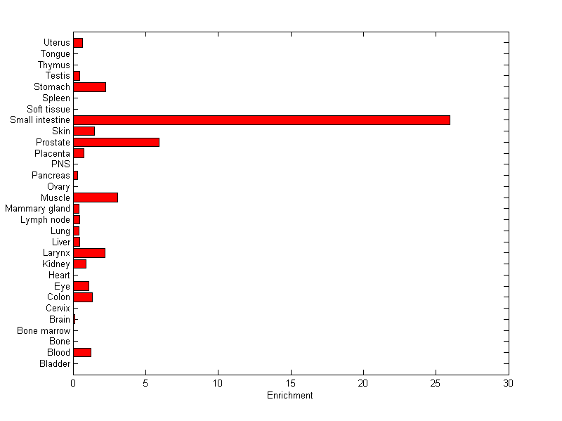 About the profile: The expression level is normalized with tissue-library size. Each value for a gene in a tissue is a ratio of observed ESTs to the expected one in this tissue. The expected number of ESTs is the product of total ESTs of the gene and the fraction of total ESTs in the tissue among all ESTs in 30 tissues. Summary: This gene is preferentially expressed in [prostate, small_intestine] Download: |