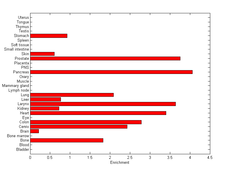 The expression level is normalized with tissue-library size. Each value for a gene in a tissue is a ratio of observed ESTs to the expected one in this tissue. The expected number of ESTs is the product of total ESTs of the gene and the fraction of total ESTs in the tissue among all ESTs in 30 tissues.