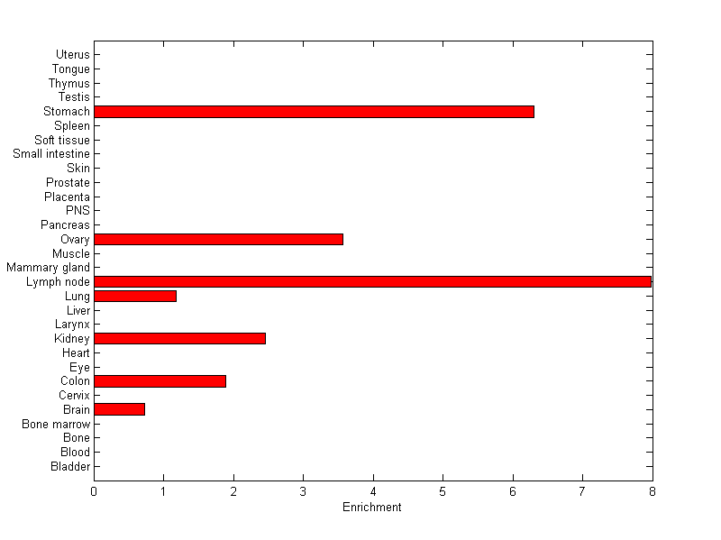 The expression level is normalized with tissue-library size. Each value for a gene in a tissue is a ratio of observed ESTs to the expected one in this tissue. The expected number of ESTs is the product of total ESTs of the gene and the fraction of total ESTs in the tissue among all ESTs in 30 tissues.