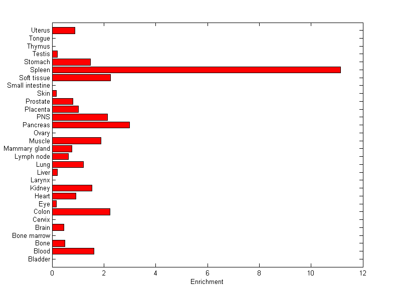 The expression level is normalized with tissue-library size. Each value for a gene in a tissue is a ratio of observed ESTs to the expected one in this tissue. The expected number of ESTs is the product of total ESTs of the gene and the fraction of total ESTs in the tissue among all ESTs in 30 tissues.