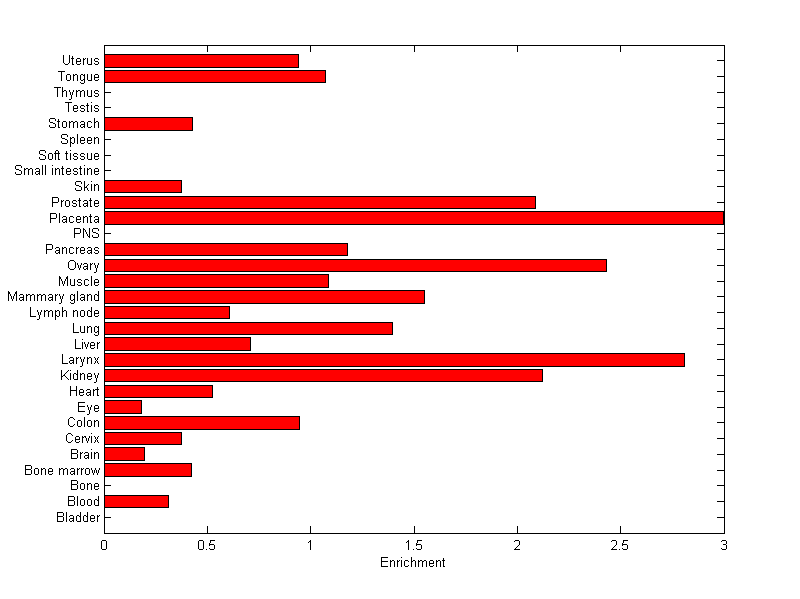 The expression level is normalized with tissue-library size. Each value for a gene in a tissue is a ratio of observed ESTs to the expected one in this tissue. The expected number of ESTs is the product of total ESTs of the gene and the fraction of total ESTs in the tissue among all ESTs in 30 tissues.