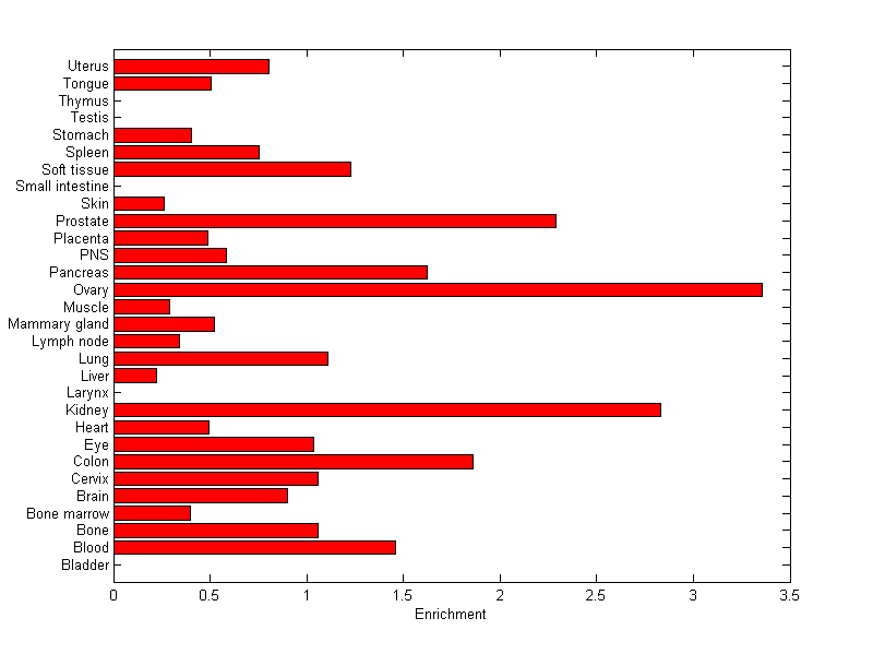 The expression level is normalized with tissue-library size. Each value for a gene in a tissue is a ratio of observed ESTs to the expected one in this tissue. The expected number of ESTs is the product of total ESTs of the gene and the fraction of total ESTs in the tissue among all ESTs in 30 tissues.