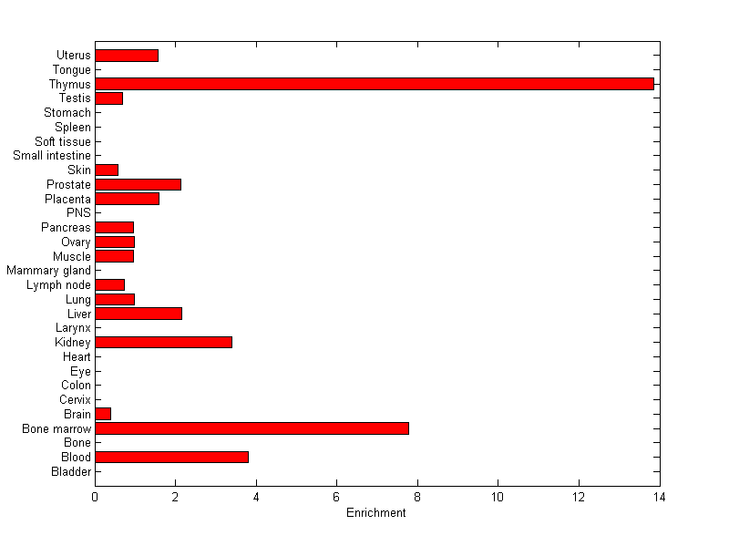The expression level is normalized with tissue-library size. Each value for a gene in a tissue is a ratio of observed ESTs to the expected one in this tissue. The expected number of ESTs is the product of total ESTs of the gene and the fraction of total ESTs in the tissue among all ESTs in 30 tissues.