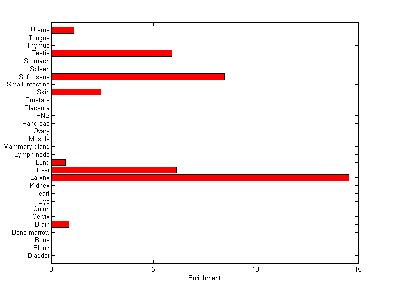 The expression level is normalized with tissue-library size. Each value for a gene in a tissue is a ratio of observed ESTs to the expected one in this tissue. The expected number of ESTs is the product of total ESTs of the gene and the fraction of total ESTs in the tissue among all ESTs in 30 tissues.