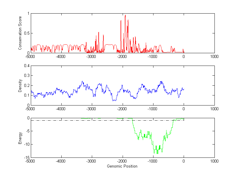 The energy profile (green curve) is about energy for module detection based on TF interaction. The positions with energy less than -1 indicate the existence of CRMs.