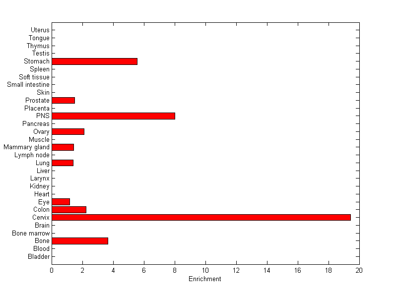 The expression level is normalized with tissue-library size. Each value for a gene in a tissue is a ratio of observed ESTs to the expected one in this tissue. The expected number of ESTs is the product of total ESTs of the gene and the fraction of total ESTs in the tissue among all ESTs in 30 tissues.
