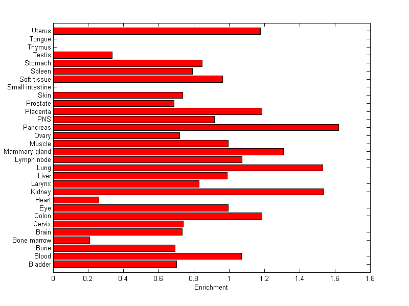 The expression level is normalized with tissue-library size. Each value for a gene in a tissue is a ratio of observed ESTs to the expected one in this tissue. The expected number of ESTs is the product of total ESTs of the gene and the fraction of total ESTs in the tissue among all ESTs in 30 tissues.