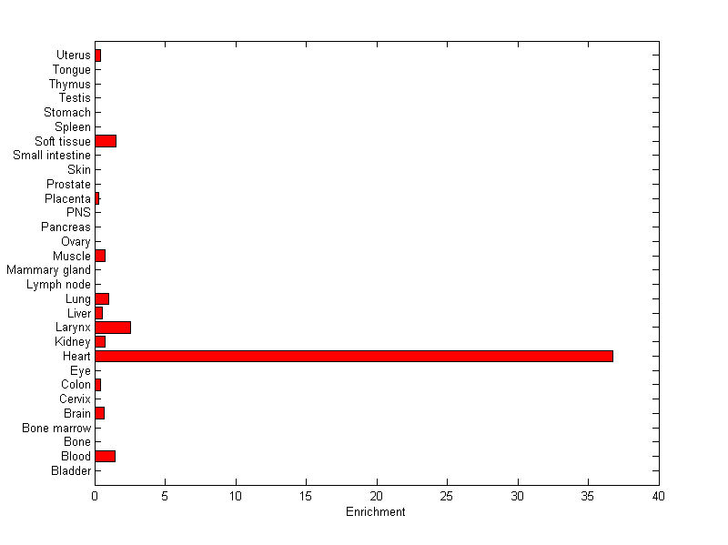 The expression level is normalized with tissue-library size. Each value for a gene in a tissue is a ratio of observed ESTs to the expected one in this tissue. The expected number of ESTs is the product of total ESTs of the gene and the fraction of total ESTs in the tissue among all ESTs in 30 tissues.