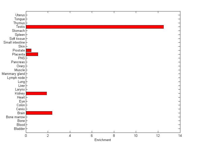The expression level is normalized with tissue-library size. Each value for a gene in a tissue is a ratio of observed ESTs to the expected one in this tissue. The expected number of ESTs is the product of total ESTs of the gene and the fraction of total ESTs in the tissue among all ESTs in 30 tissues.
