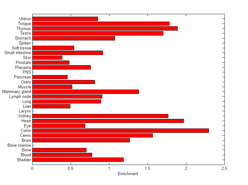 The expression level is normalized with tissue-library size. Each value for a gene in a tissue is a ratio of observed ESTs to the expected one in this tissue. The expected number of ESTs is the product of total ESTs of the gene and the fraction of total ESTs in the tissue among all ESTs in 30 tissues.