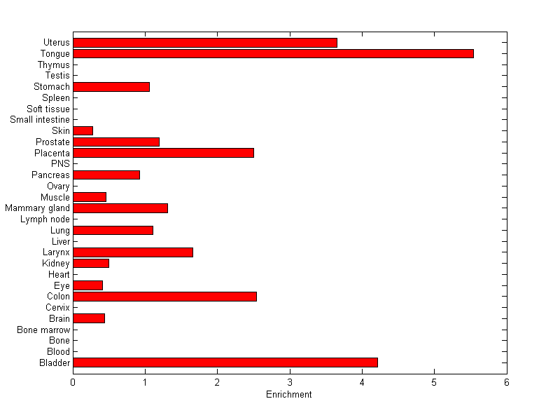 The expression level is normalized with tissue-library size. Each value for a gene in a tissue is a ratio of observed ESTs to the expected one in this tissue. The expected number of ESTs is the product of total ESTs of the gene and the fraction of total ESTs in the tissue among all ESTs in 30 tissues.