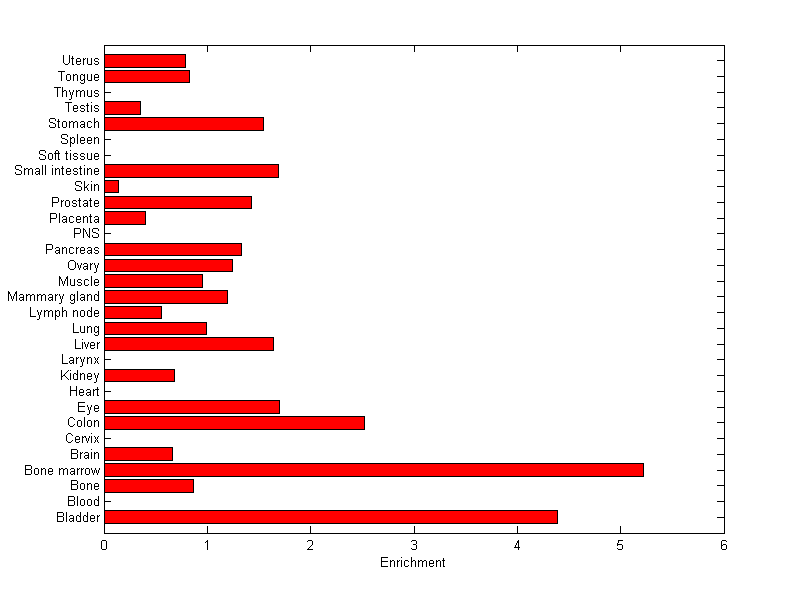 The expression level is normalized with tissue-library size. Each value for a gene in a tissue is a ratio of observed ESTs to the expected one in this tissue. The expected number of ESTs is the product of total ESTs of the gene and the fraction of total ESTs in the tissue among all ESTs in 30 tissues.