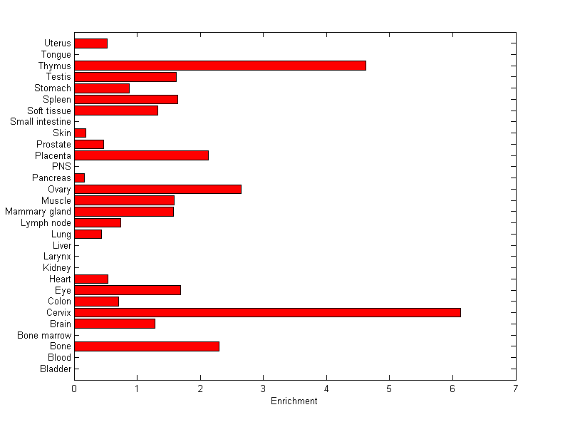 About the profile: The expression level is normalized with tissue-library size. Each value for a gene in a tissue is a ratio of observed ESTs to the expected one in this tissue. The expected number of ESTs is the product of total ESTs of the gene and the fraction of total ESTs in the tissue among all ESTs in 30 tissues. Summary: This gene is preferentially expressed in [cervix] Download: |