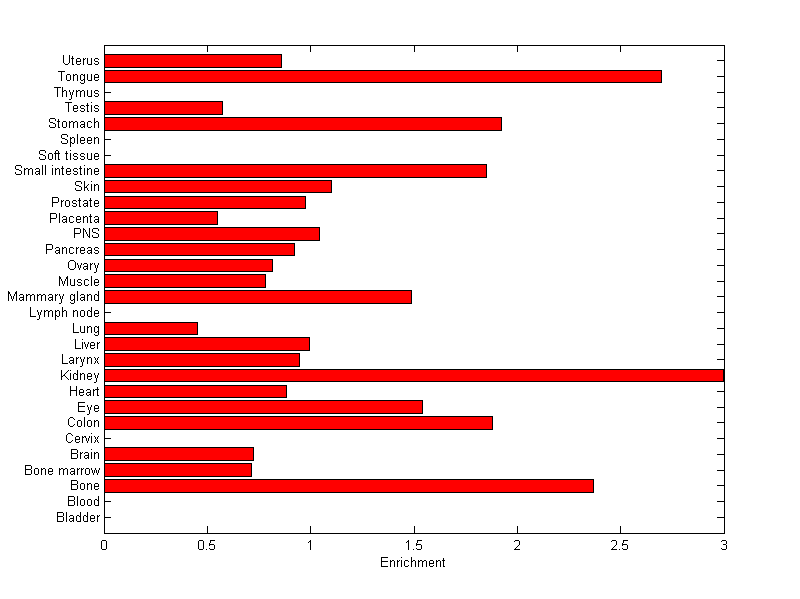 The expression level is normalized with tissue-library size. Each value for a gene in a tissue is a ratio of observed ESTs to the expected one in this tissue. The expected number of ESTs is the product of total ESTs of the gene and the fraction of total ESTs in the tissue among all ESTs in 30 tissues.