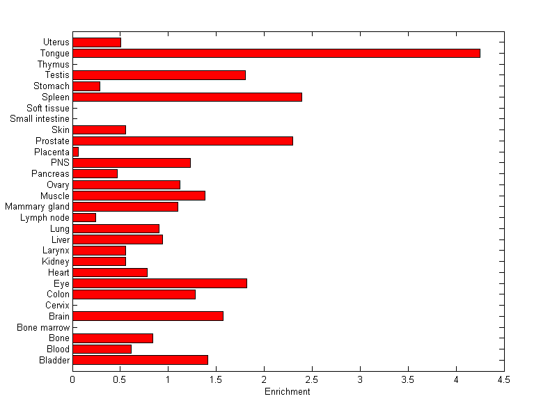 The expression level is normalized with tissue-library size. Each value for a gene in a tissue is a ratio of observed ESTs to the expected one in this tissue. The expected number of ESTs is the product of total ESTs of the gene and the fraction of total ESTs in the tissue among all ESTs in 30 tissues.