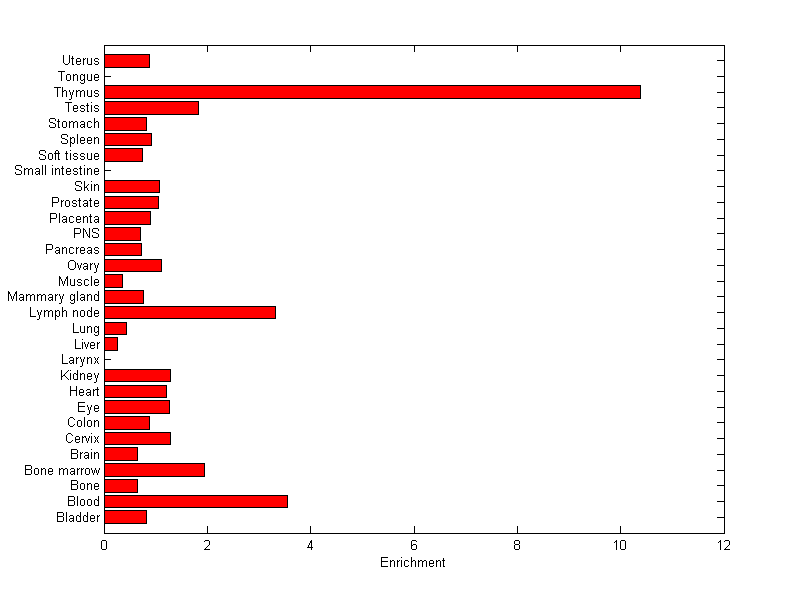 The expression level is normalized with tissue-library size. Each value for a gene in a tissue is a ratio of observed ESTs to the expected one in this tissue. The expected number of ESTs is the product of total ESTs of the gene and the fraction of total ESTs in the tissue among all ESTs in 30 tissues.