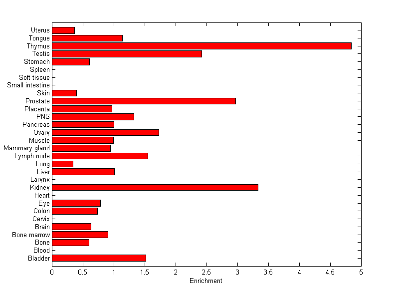 The expression level is normalized with tissue-library size. Each value for a gene in a tissue is a ratio of observed ESTs to the expected one in this tissue. The expected number of ESTs is the product of total ESTs of the gene and the fraction of total ESTs in the tissue among all ESTs in 30 tissues.