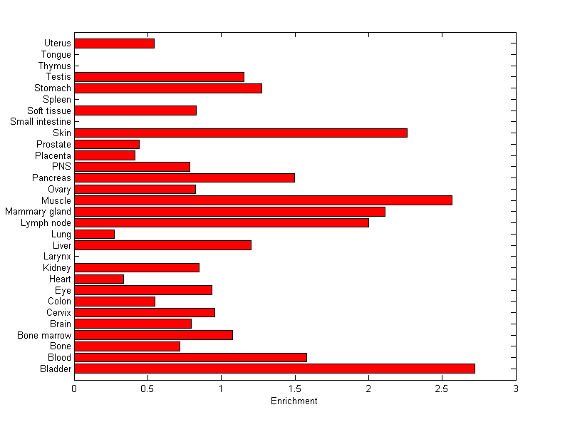 The expression level is normalized with tissue-library size. Each value for a gene in a tissue is a ratio of observed ESTs to the expected one in this tissue. The expected number of ESTs is the product of total ESTs of the gene and the fraction of total ESTs in the tissue among all ESTs in 30 tissues.