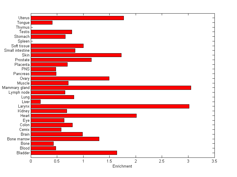 The expression level is normalized with tissue-library size. Each value for a gene in a tissue is a ratio of observed ESTs to the expected one in this tissue. The expected number of ESTs is the product of total ESTs of the gene and the fraction of total ESTs in the tissue among all ESTs in 30 tissues.