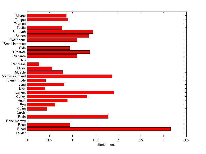 The expression level is normalized with tissue-library size. Each value for a gene in a tissue is a ratio of observed ESTs to the expected one in this tissue. The expected number of ESTs is the product of total ESTs of the gene and the fraction of total ESTs in the tissue among all ESTs in 30 tissues.
