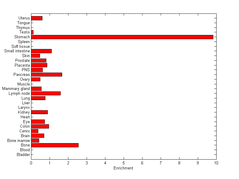 The expression level is normalized with tissue-library size. Each value for a gene in a tissue is a ratio of observed ESTs to the expected one in this tissue. The expected number of ESTs is the product of total ESTs of the gene and the fraction of total ESTs in the tissue among all ESTs in 30 tissues.