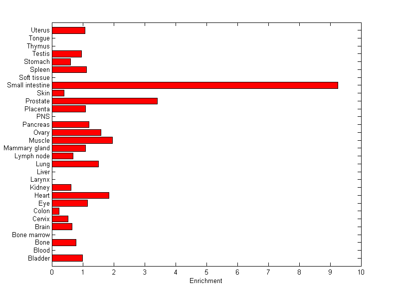 The expression level is normalized with tissue-library size. Each value for a gene in a tissue is a ratio of observed ESTs to the expected one in this tissue. The expected number of ESTs is the product of total ESTs of the gene and the fraction of total ESTs in the tissue among all ESTs in 30 tissues.