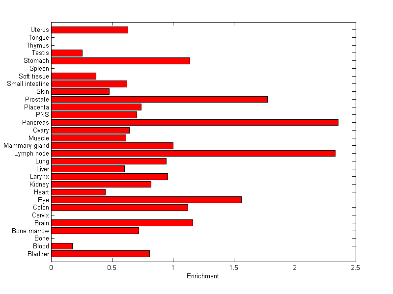 The expression level is normalized with tissue-library size. Each value for a gene in a tissue is a ratio of observed ESTs to the expected one in this tissue. The expected number of ESTs is the product of total ESTs of the gene and the fraction of total ESTs in the tissue among all ESTs in 30 tissues.