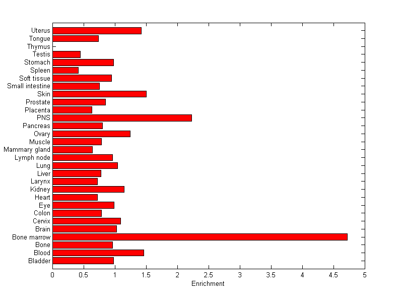 The expression level is normalized with tissue-library size. Each value for a gene in a tissue is a ratio of observed ESTs to the expected one in this tissue. The expected number of ESTs is the product of total ESTs of the gene and the fraction of total ESTs in the tissue among all ESTs in 30 tissues.