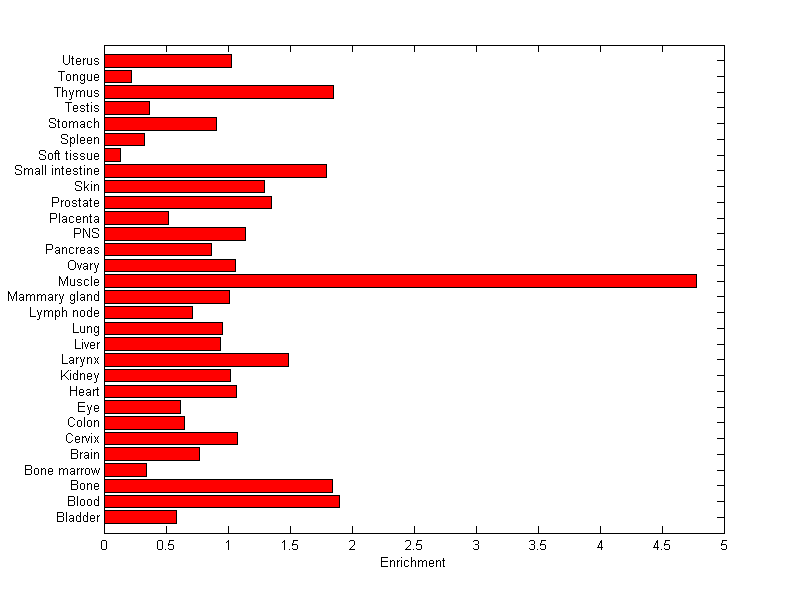 The expression level is normalized with tissue-library size. Each value for a gene in a tissue is a ratio of observed ESTs to the expected one in this tissue. The expected number of ESTs is the product of total ESTs of the gene and the fraction of total ESTs in the tissue among all ESTs in 30 tissues.