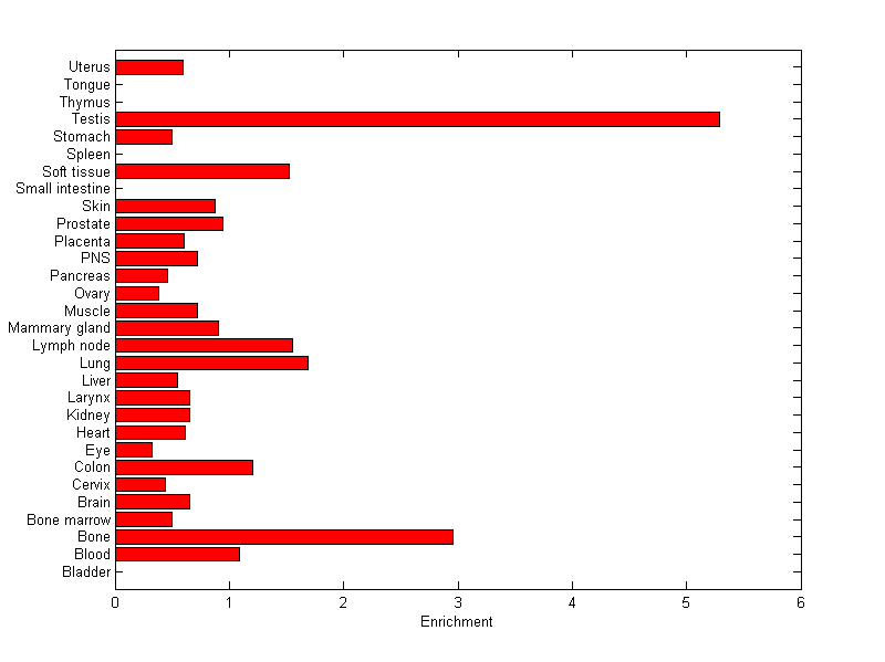 The expression level is normalized with tissue-library size. Each value for a gene in a tissue is a ratio of observed ESTs to the expected one in this tissue. The expected number of ESTs is the product of total ESTs of the gene and the fraction of total ESTs in the tissue among all ESTs in 30 tissues.