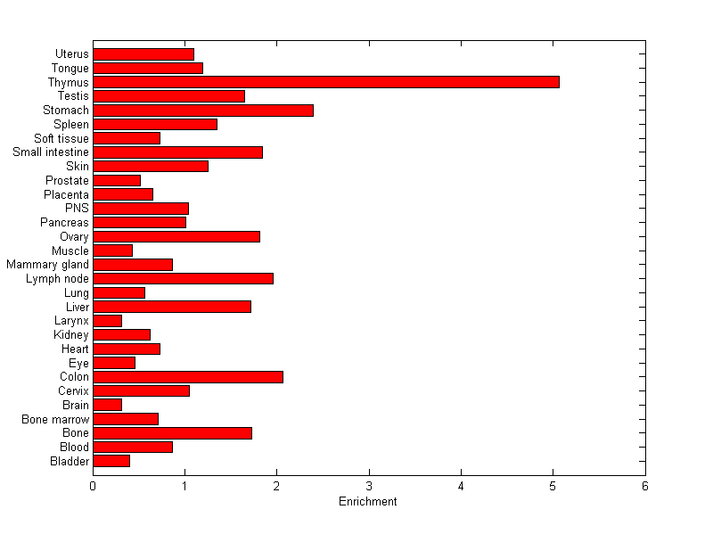 The expression level is normalized with tissue-library size. Each value for a gene in a tissue is a ratio of observed ESTs to the expected one in this tissue. The expected number of ESTs is the product of total ESTs of the gene and the fraction of total ESTs in the tissue among all ESTs in 30 tissues.