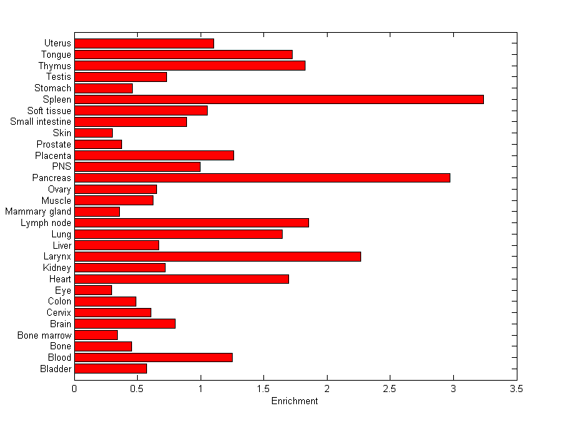 The expression level is normalized with tissue-library size. Each value for a gene in a tissue is a ratio of observed ESTs to the expected one in this tissue. The expected number of ESTs is the product of total ESTs of the gene and the fraction of total ESTs in the tissue among all ESTs in 30 tissues.