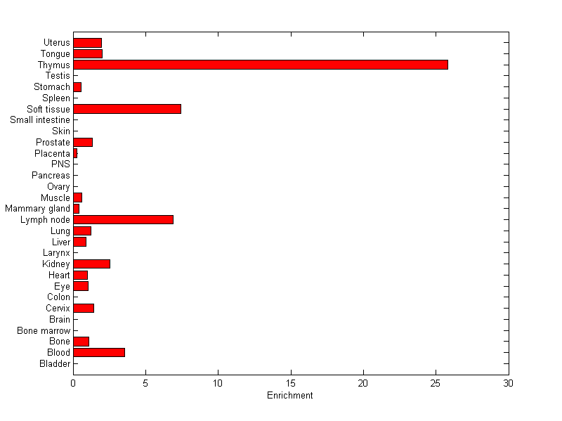 The expression level is normalized with tissue-library size. Each value for a gene in a tissue is a ratio of observed ESTs to the expected one in this tissue. The expected number of ESTs is the product of total ESTs of the gene and the fraction of total ESTs in the tissue among all ESTs in 30 tissues.