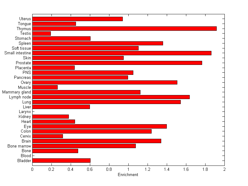 The expression level is normalized with tissue-library size. Each value for a gene in a tissue is a ratio of observed ESTs to the expected one in this tissue. The expected number of ESTs is the product of total ESTs of the gene and the fraction of total ESTs in the tissue among all ESTs in 30 tissues.