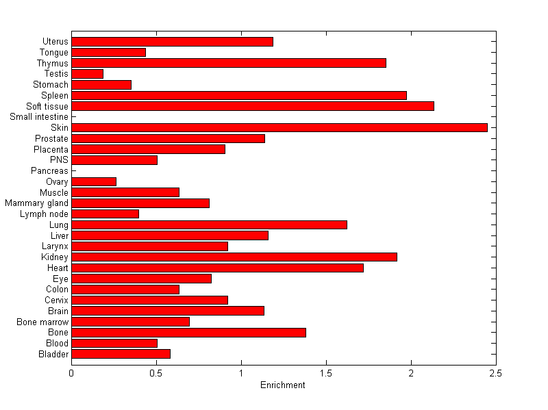 The expression level is normalized with tissue-library size. Each value for a gene in a tissue is a ratio of observed ESTs to the expected one in this tissue. The expected number of ESTs is the product of total ESTs of the gene and the fraction of total ESTs in the tissue among all ESTs in 30 tissues.
