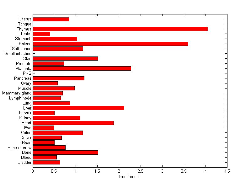 The expression level is normalized with tissue-library size. Each value for a gene in a tissue is a ratio of observed ESTs to the expected one in this tissue. The expected number of ESTs is the product of total ESTs of the gene and the fraction of total ESTs in the tissue among all ESTs in 30 tissues.