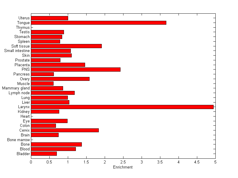 The expression level is normalized with tissue-library size. Each value for a gene in a tissue is a ratio of observed ESTs to the expected one in this tissue. The expected number of ESTs is the product of total ESTs of the gene and the fraction of total ESTs in the tissue among all ESTs in 30 tissues.