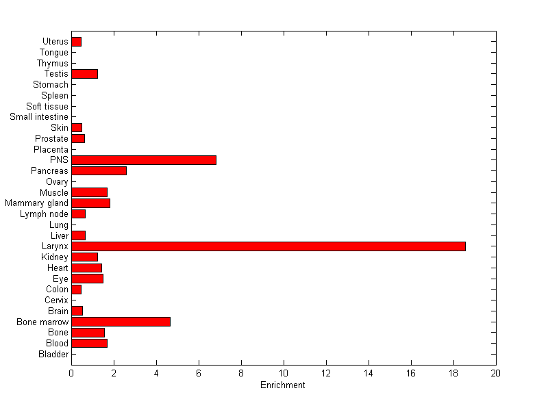 The expression level is normalized with tissue-library size. Each value for a gene in a tissue is a ratio of observed ESTs to the expected one in this tissue. The expected number of ESTs is the product of total ESTs of the gene and the fraction of total ESTs in the tissue among all ESTs in 30 tissues.
