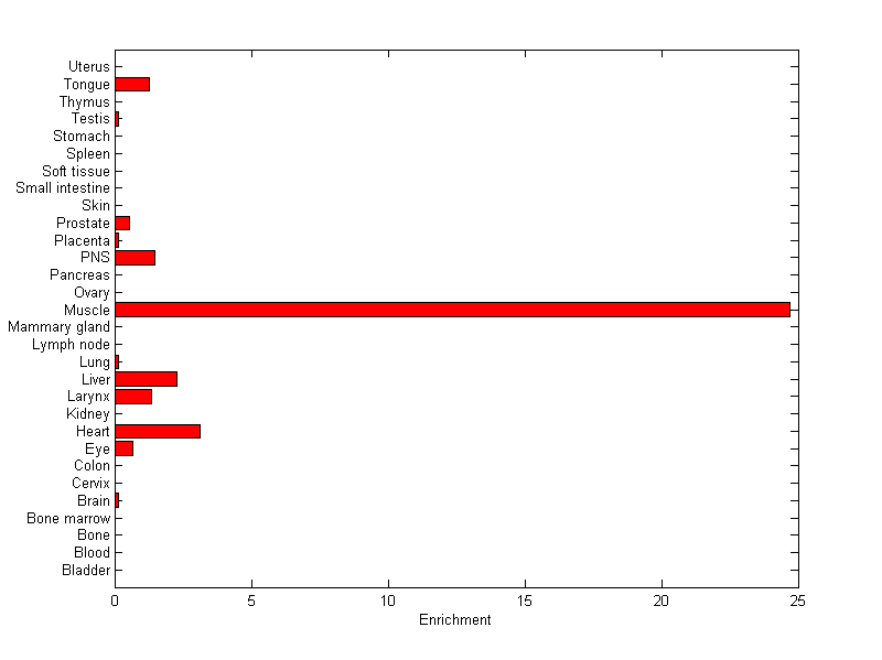 The expression level is normalized with tissue-library size. Each value for a gene in a tissue is a ratio of observed ESTs to the expected one in this tissue. The expected number of ESTs is the product of total ESTs of the gene and the fraction of total ESTs in the tissue among all ESTs in 30 tissues.